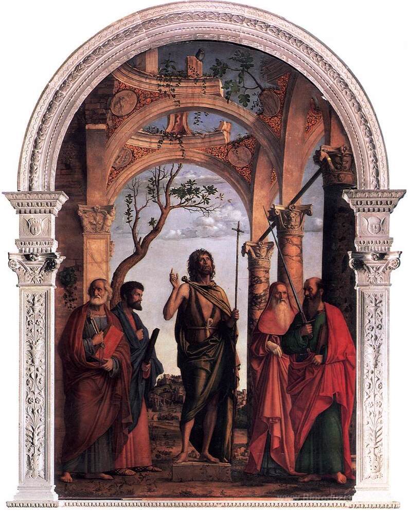 Ti offriamo una riproduzione artigianale su tela dell'opera famosa 'San Giovanni Battista e Santi' di Cima da Conegliano, dal Museo delle Riproduzioni.