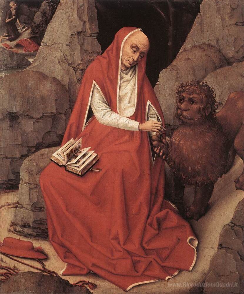 Ti offriamo una riproduzione artigianale su tela dell'opera famosa 'San Girolamo e il leone' di Rogier van der Weyden, dal Museo delle Riproduzioni.