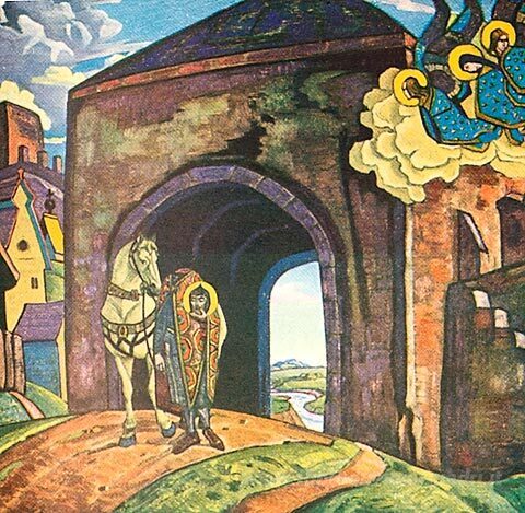 Ti offriamo una riproduzione artigianale su tela dell'opera famosa 'San Mercurio di Smolensk' di Nicholas Roerich, dal Museo delle Riproduzioni.
