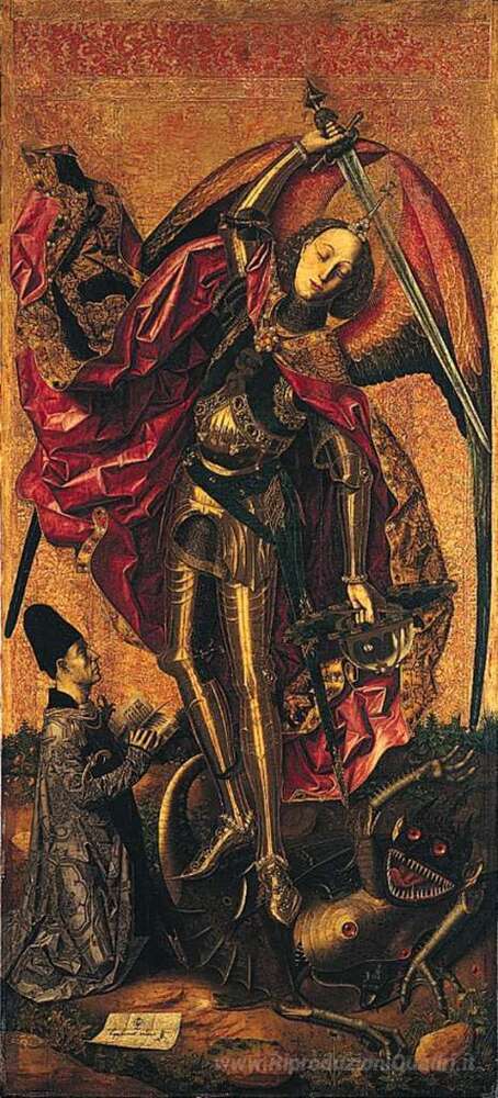 Ti offriamo una riproduzione artigianale su tela dell'opera famosa 'San Michele trionfa sul Diavolo' di Bartolome Bermejo, dal Museo delle Riproduzioni.