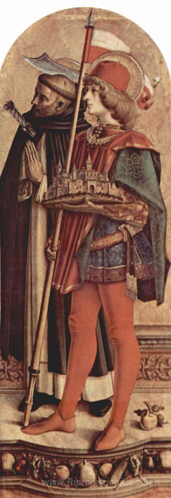 Ti offriamo una riproduzione artigianale su tela dell'opera famosa 'San Pietro Martire e San Venetianus di Camerino' di Carlo Crivelli, dal Museo delle Riproduzioni.
