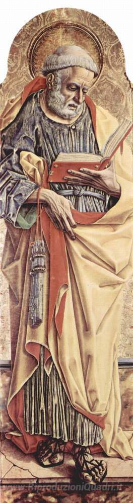 Ti offriamo una riproduzione artigianale su tela dell'opera famosa 'San Pietro' di Carlo Crivelli, dal Museo delle Riproduzioni.