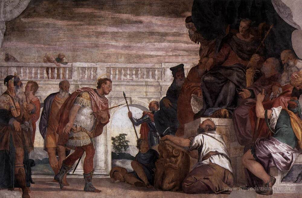 Ti offriamo una riproduzione artigianale su tela dell'opera famosa 'San Sebastiano Rimproverando Diocleziano' di Paolo Veronese, dal Museo delle Riproduzioni.