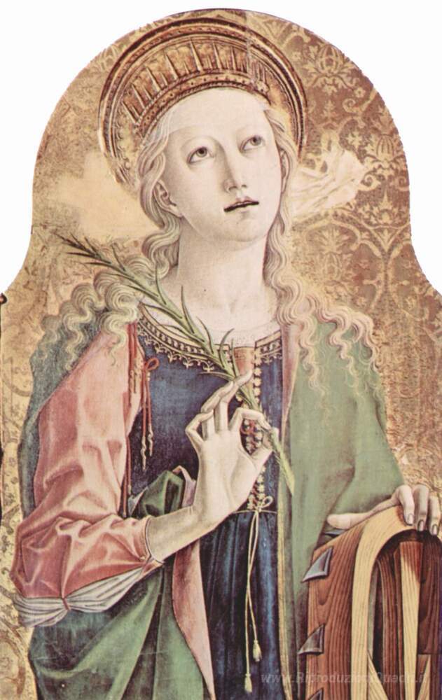 Ti offriamo una riproduzione artigianale su tela dell'opera famosa 'Santa Caterina d'Alessandria' di Carlo Crivelli, dal Museo delle Riproduzioni.