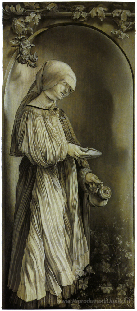 Ti offriamo una riproduzione artigianale su tela dell'opera famosa 'Santa Elisabetta d'Ungheria' di Matthias Grünewald, dal Museo delle Riproduzioni.