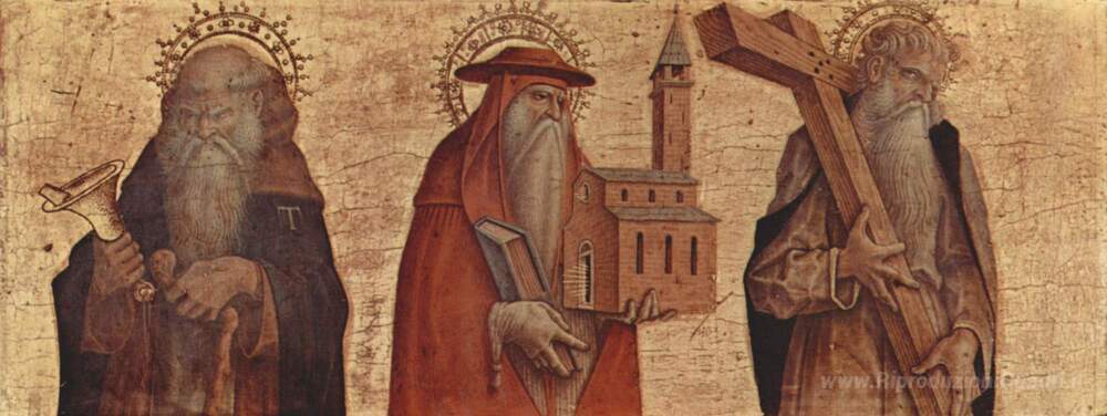 Ti offriamo una riproduzione artigianale su tela dell'opera famosa 'Sant'Antonio, San Girolamo, Sant'Andrea' di Carlo Crivelli, dal Museo delle Riproduzioni.
