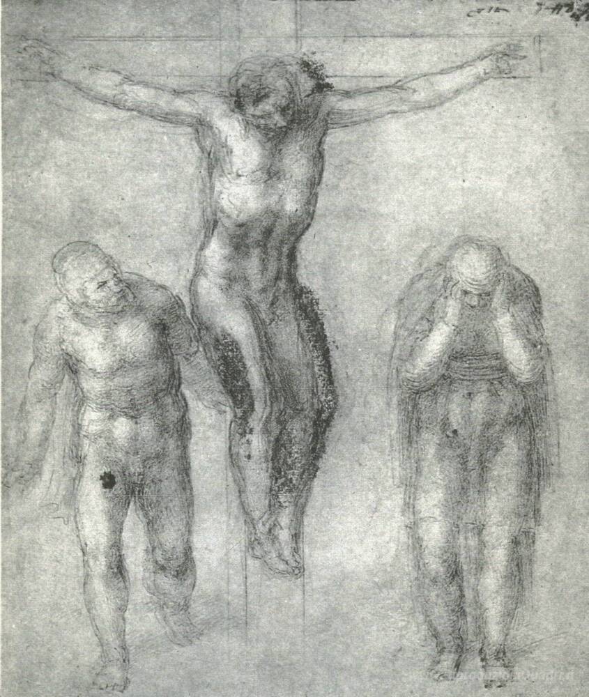 Ti offriamo una riproduzione artigianale su tela dell'opera famosa 'Studio per "Cristo sulla croce con Dolenti"' di Michelangelo, dal Museo delle Riproduzioni.