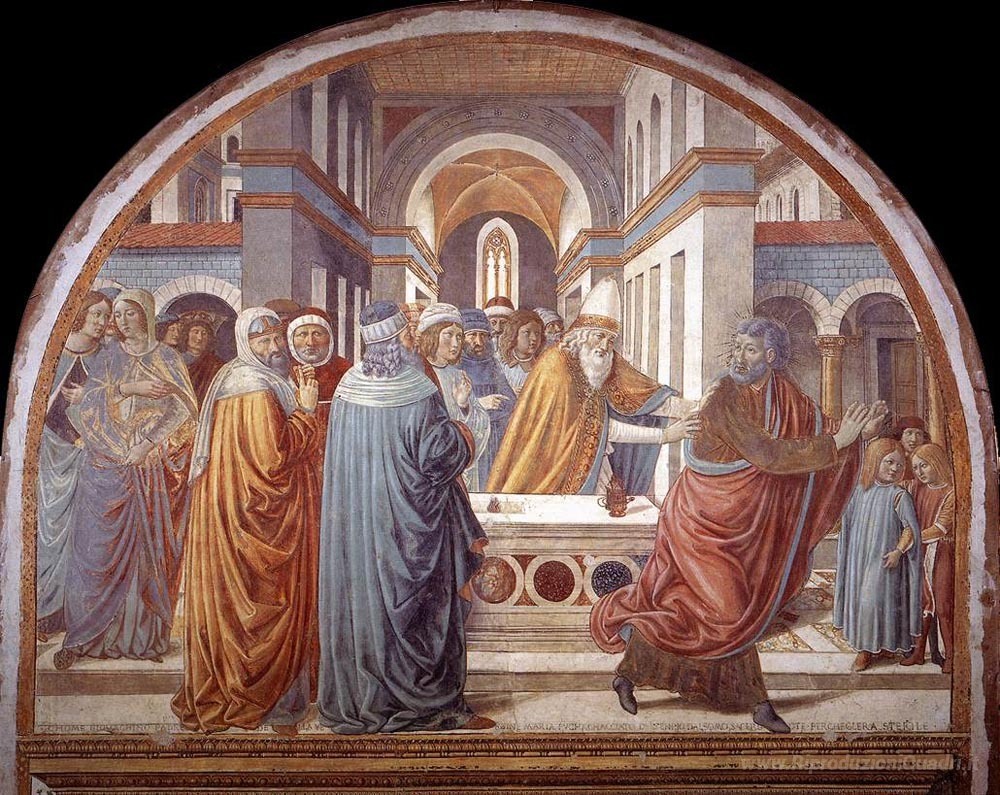 Scoprite l'incanto artistico del Tabernacolo della Visitazione: Expulsione di Gioacchino dal Tempio realizzato dal maestro rinascimentale Benozzo Gozzoli. Questo straordinario dipinto a olio cattura l’essenza dell’arte italiana, combinando abilmente emozione e tecnica in un’opera che racconta una storia profonda e delicata. Gozzoli, noto per la sua abilità nel creare atmosfere vivide e dettagliate, utilizza una palette ricca e luminosa che invita lo spettatore a immergersi nel dramma e nella bellezza della scena rappresentata.