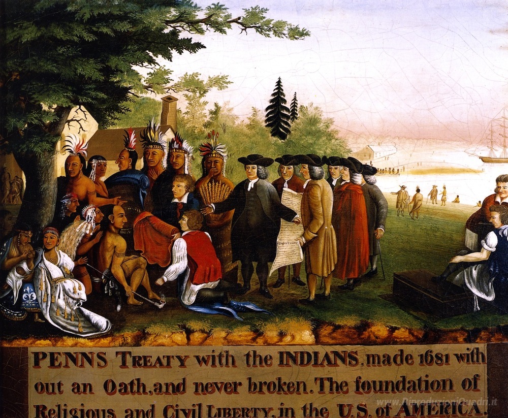 Ti offriamo una riproduzione artigianale su tela dell'opera famosa 'Trattato di Penn con gli indiani' di Edward Hicks, dal Museo delle Riproduzioni.