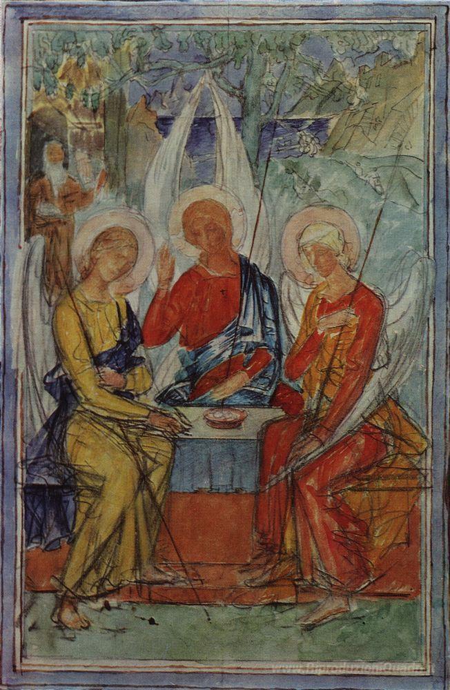 Ti offriamo una riproduzione artigianale su tela dell'opera famosa 'Trinità' di Kuzma Petrov-Vodkin, dal Museo delle Riproduzioni.
