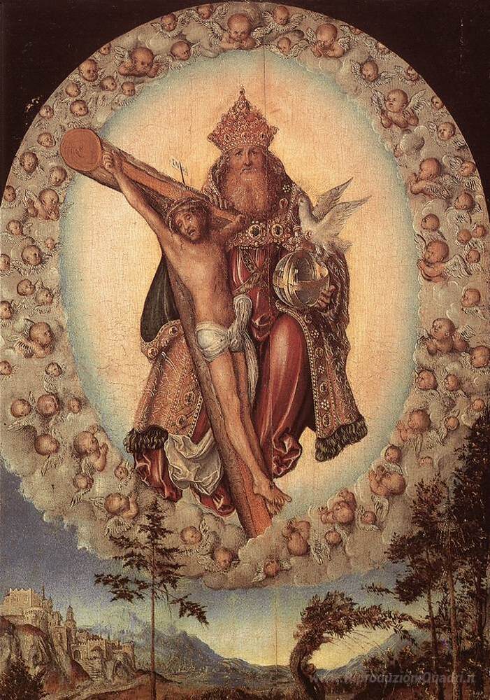 Ti offriamo una riproduzione artigianale su tela dell'opera famosa 'Trinità' di Lucas Cranach the Elder, dal Museo delle Riproduzioni.
