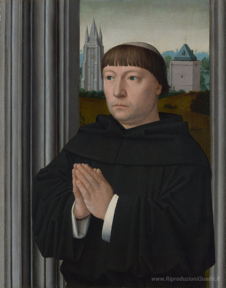 Ti offriamo una riproduzione artigianale su tela dell'opera famosa 'Un frate agostiniano preghiera' di Gerard David, dal Museo delle Riproduzioni.