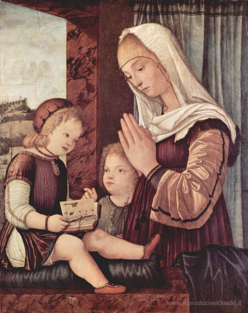 Ti offriamo una riproduzione artigianale su tela dell'opera famosa 'Vergine Maria e Giovanni Battista, pregando il Cristo bambino' di Vittore Carpaccio, dal Museo delle Riproduzioni.