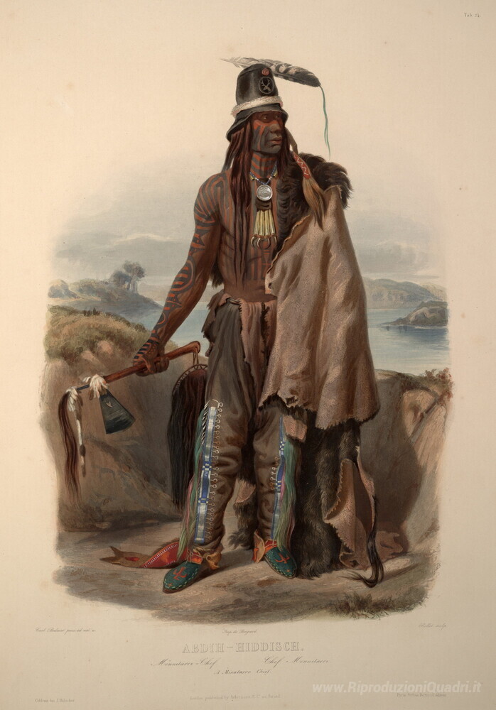 Ti offriamo una riproduzione artigianale su tela dell'opera famosa 'Abdih- Hiddisch. Un capo Minatarre, piatto 24 dal volume 1 'Viag' di Karl Bodmer, dal Museo delle Riproduzioni.
