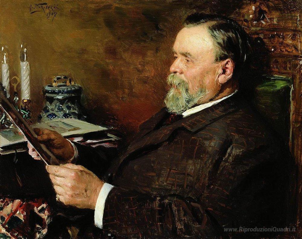 Ti offriamo una riproduzione artigianale su tela dell'opera famosa 'Amante della pittura. Ritratto di un collezionista I. E. Tsvetko' di Vladimir Makovsky, dal Museo delle Riproduzioni.