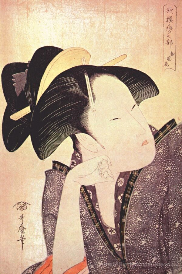 Ti offriamo una riproduzione artigianale su tela dell'opera famosa 'Amore Pensieroso' di Kitagawa Utamaro, dal Museo delle Riproduzioni.