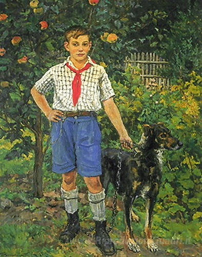 Ti offriamo una riproduzione artigianale su tela dell'opera famosa 'Andron con un cane' di Pyotr Konchalovsky, dal Museo delle Riproduzioni.