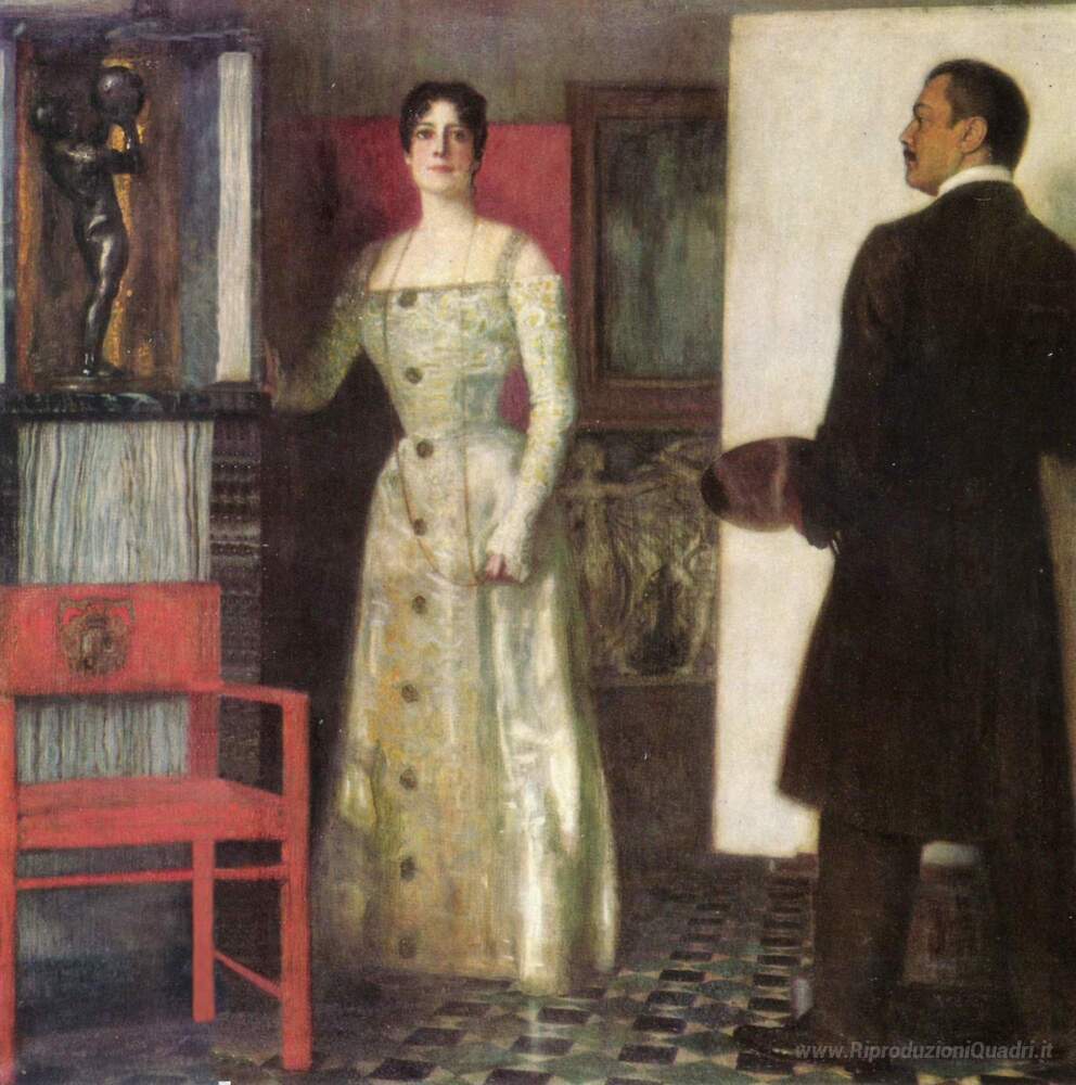 Ti offriamo una riproduzione artigianale su tela dell'opera famosa 'Autoritratto del pittore e la moglie in studio' di Franz Stuck, dal Museo delle Riproduzioni.