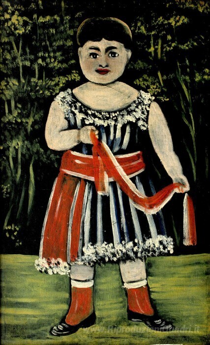 Ti offriamo una riproduzione artigianale su tela dell'opera famosa 'Bambina con un fiocco rosso' di Niko Pirosmani, dal Museo delle Riproduzioni.