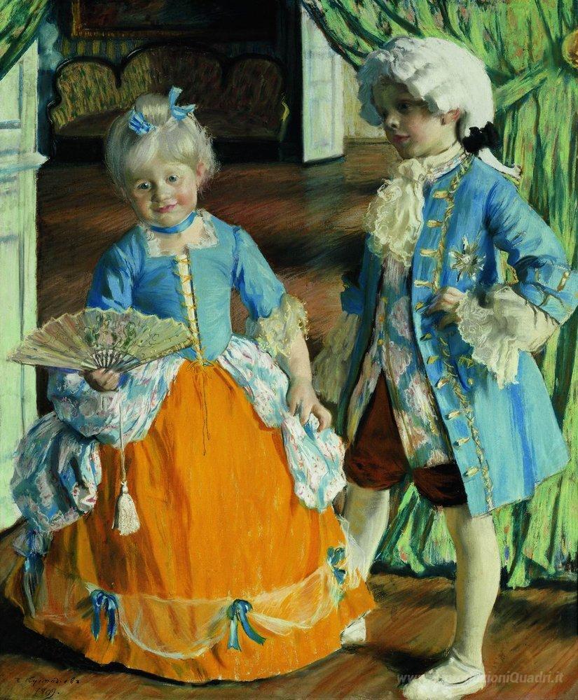 Ti offriamo una riproduzione artigianale su tela dell'opera famosa 'Bambini in costumi' di Boris Kustodiev, dal Museo delle Riproduzioni.