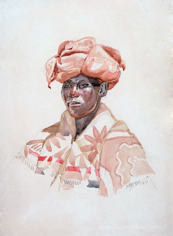 Ti offriamo una riproduzione artigianale su tela dell'opera famosa 'Basoth donna con copricapo' di George Pemba, dal Museo delle Riproduzioni.