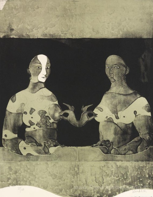 Ti offriamo una riproduzione artigianale su tela dell'opera famosa 'Bosomfriends I' di Paul Wunderlich, dal Museo delle Riproduzioni.