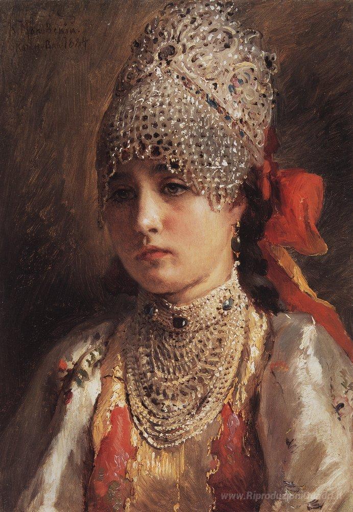 Ti offriamo una riproduzione artigianale su tela dell'opera famosa 'Boyaryshnya' di Konstantin Makovsky, dal Museo delle Riproduzioni.