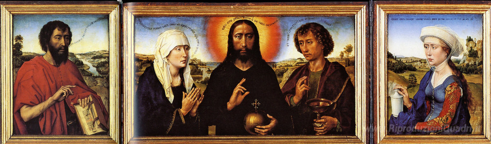 Ti offriamo una riproduzione artigianale su tela dell'opera famosa 'Braque famiglia Trittico' di Rogier van der Weyden, dal Museo delle Riproduzioni.