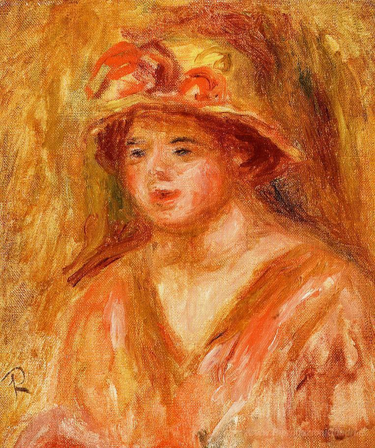 Ti offriamo una riproduzione artigianale su tela dell'opera famosa 'Busto di una giovane ragazza in un cappello di paglia' di Pierre-Auguste Renoir, dal Museo delle Riproduzioni.