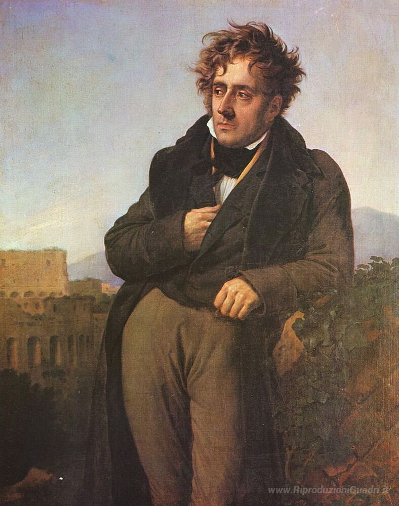 Ti offriamo una riproduzione artigianale su tela dell'opera famosa 'Chateaubriand Meditando sulle rovine di Roma' di Anne-Louis Girodet, dal Museo delle Riproduzioni.