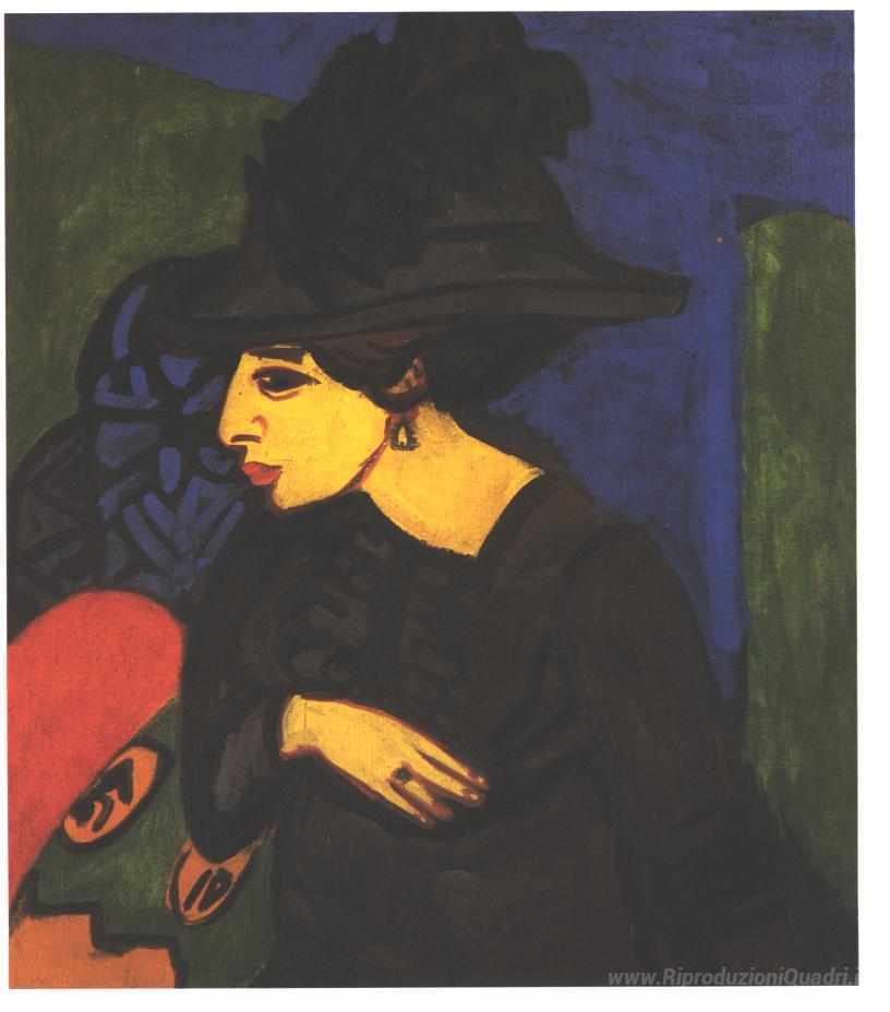 Ti offriamo una riproduzione artigianale su tela dell'opera famosa 'Dodo con una piuma grande cappello' di Ernst Ludwig Kirchner, dal Museo delle Riproduzioni.