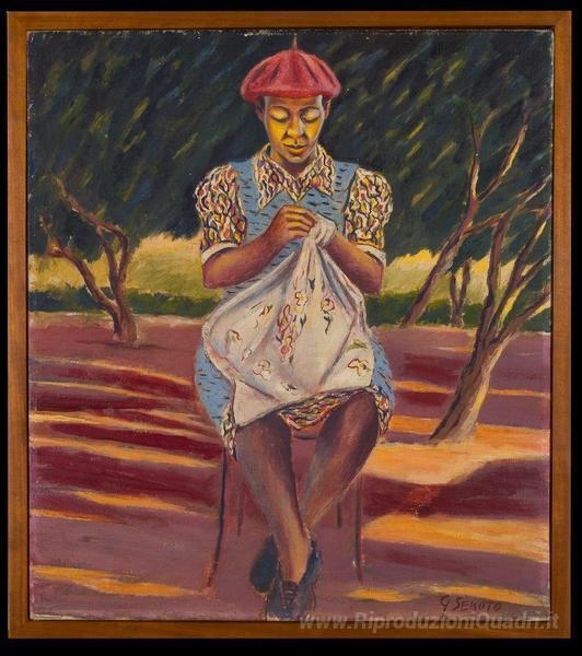 Ti offriamo una riproduzione artigianale su tela dell'opera famosa 'Donna che cuce (MARY DIKGILEDI)' di Gerard Sekoto, dal Museo delle Riproduzioni.