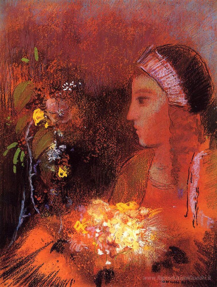 Ti offriamo una riproduzione artigianale su tela dell'opera famosa 'Donna con i fiori' di Odilon Redon, dal Museo delle Riproduzioni.