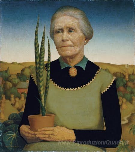 Ti offriamo una riproduzione artigianale su tela dell'opera famosa 'Donna con le piante' di Grant Wood, dal Museo delle Riproduzioni.
