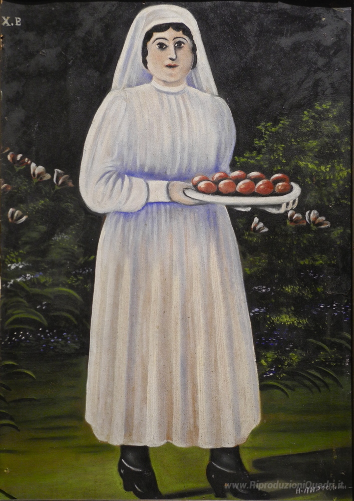 Ti offriamo una riproduzione artigianale su tela dell'opera famosa 'Donna con le uova di Pasqua' di Niko Pirosmani, dal Museo delle Riproduzioni.