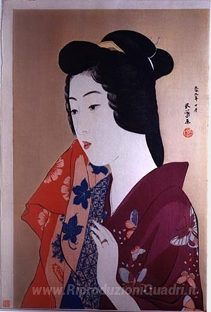Ti offriamo una riproduzione artigianale su tela dell'opera famosa 'Donna con un asciugamano a mano' di Goyo Hashiguchi, dal Museo delle Riproduzioni.