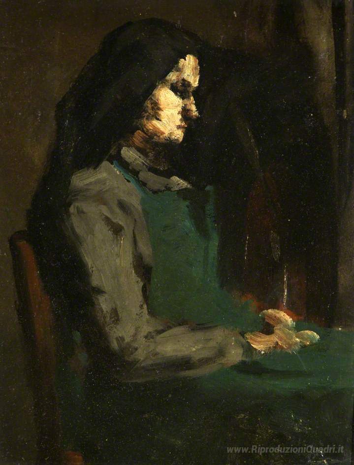 Ti offriamo una riproduzione artigianale su tela dell'opera famosa 'Donna con un grembiule verde' di Theodule Ribot, dal Museo delle Riproduzioni.