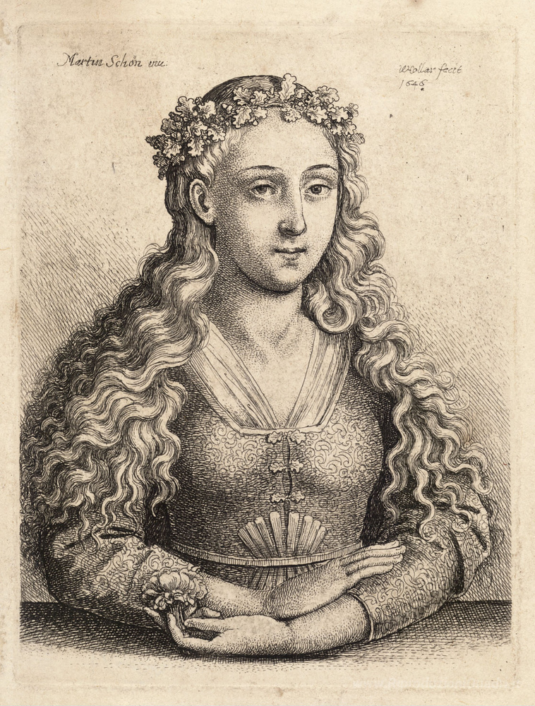 Ti offriamo una riproduzione artigianale su tela dell'opera famosa 'Donna con una corona di foglie di quercia' di Martin Schongauer, dal Museo delle Riproduzioni.