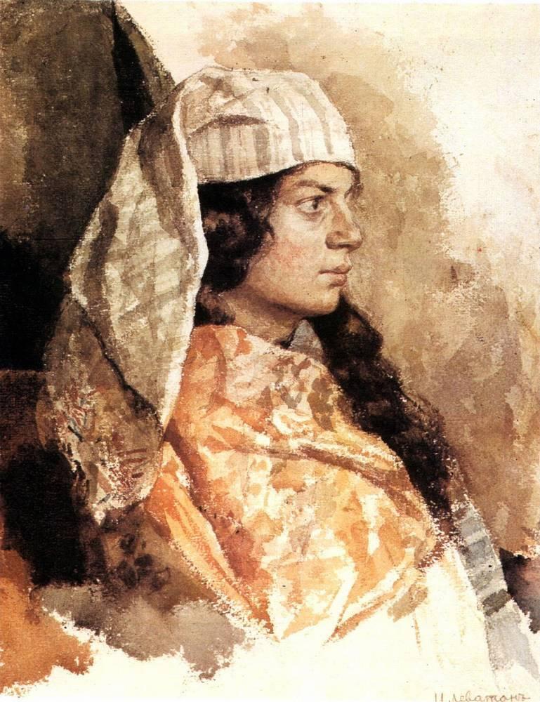 Ti offriamo una riproduzione artigianale su tela dell'opera famosa 'Donna ebrea con scialle orientale' di Isaac Levitan, dal Museo delle Riproduzioni.