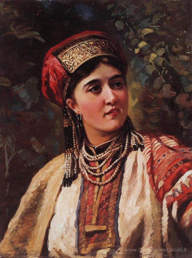Ti offriamo una riproduzione artigianale su tela dell'opera famosa 'Donna in un costume nazionale' di Konstantin Makovsky, dal Museo delle Riproduzioni.