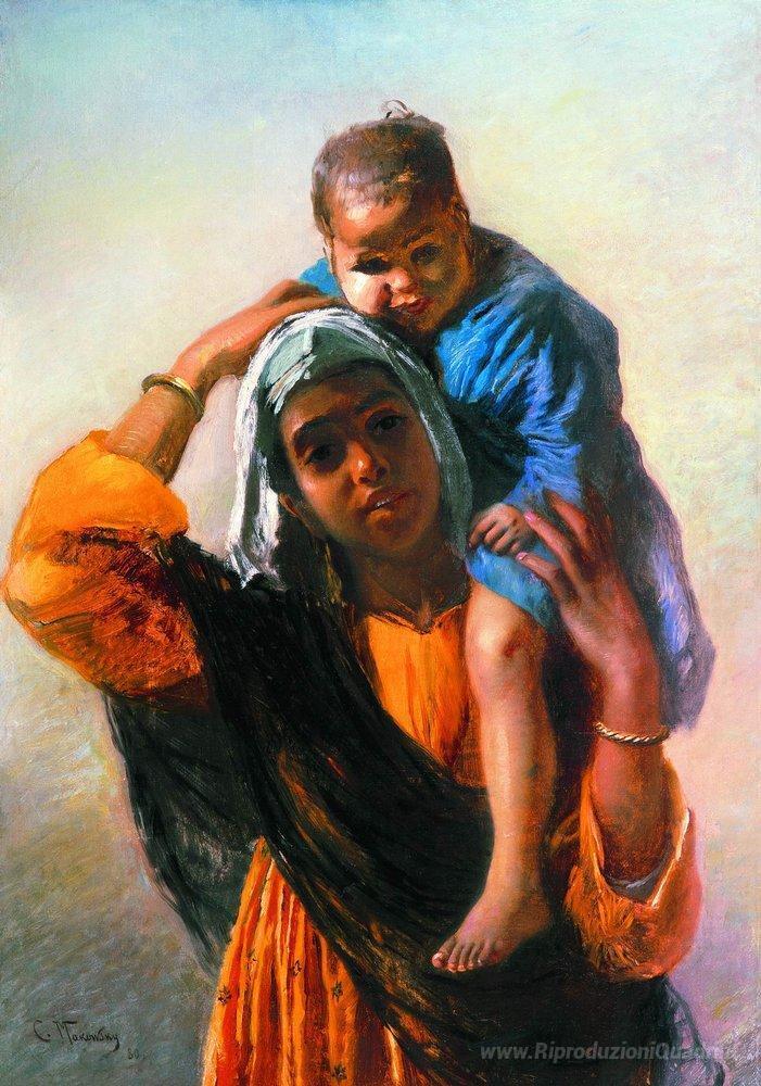 Ti offriamo una riproduzione artigianale su tela dell'opera famosa 'Donna orientale con un bambino' di Konstantin Makovsky, dal Museo delle Riproduzioni.