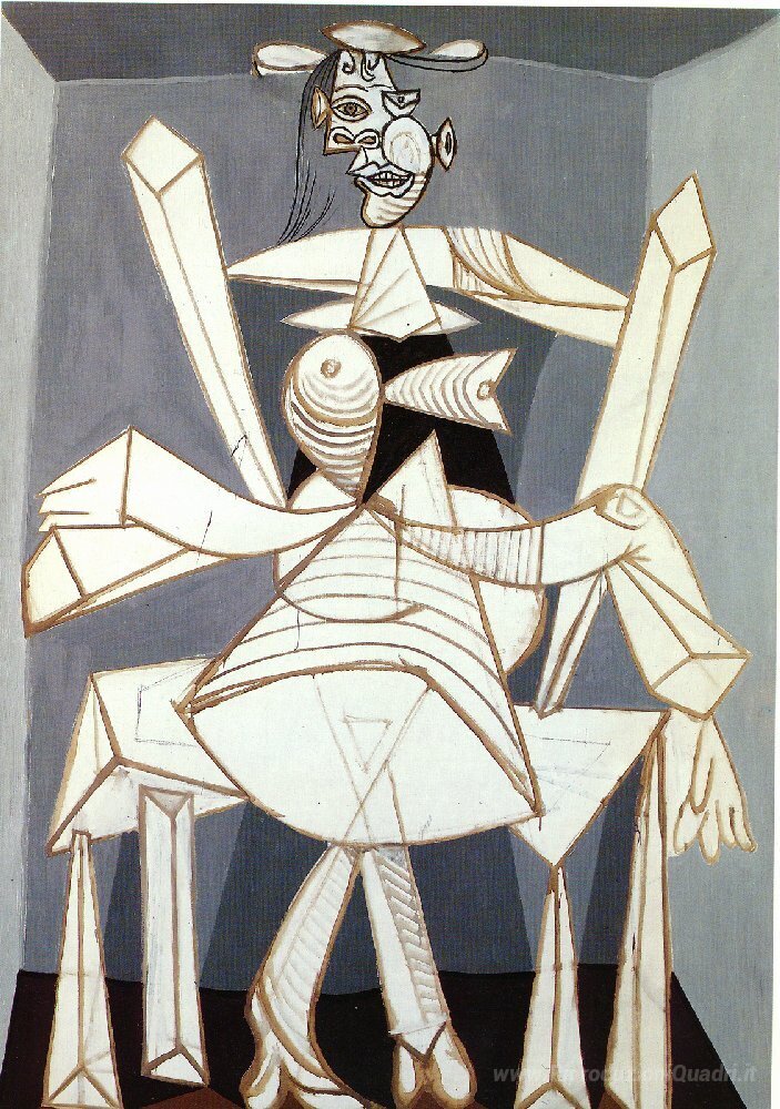 Ti offriamo una riproduzione artigianale su tela dell'opera famosa 'Donna seduta in poltrona' di Pablo Picasso, dal Museo delle Riproduzioni.