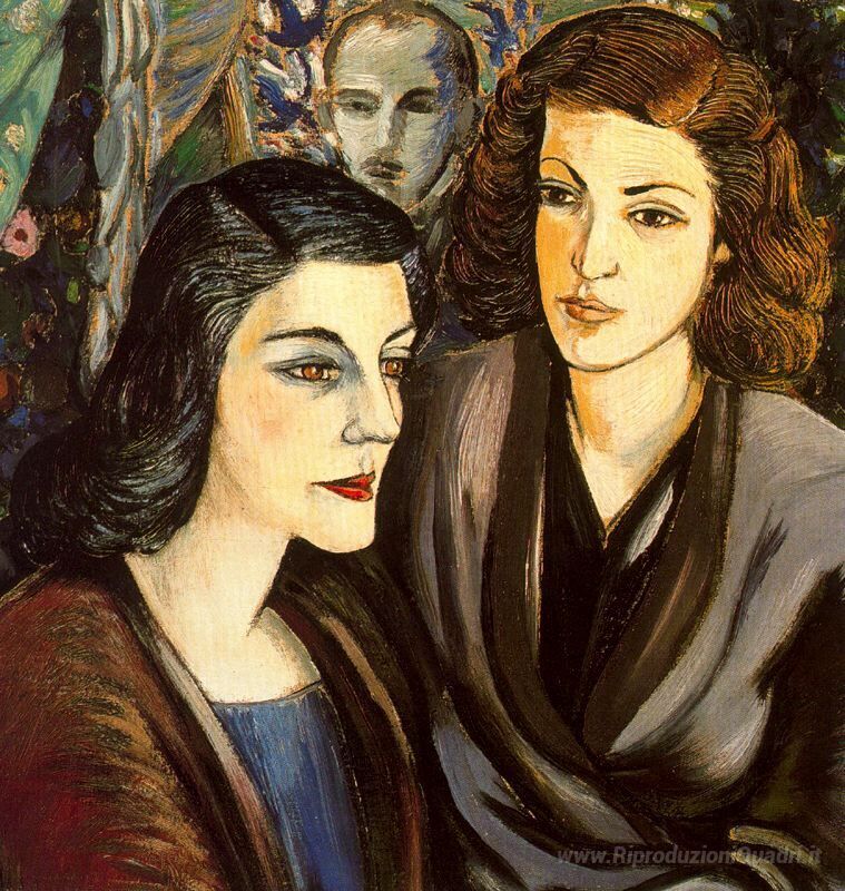 Ti offriamo una riproduzione artigianale su tela dell'opera famosa 'Due donna e l'autoritratto busto' di Rafael Zabaleta, dal Museo delle Riproduzioni.