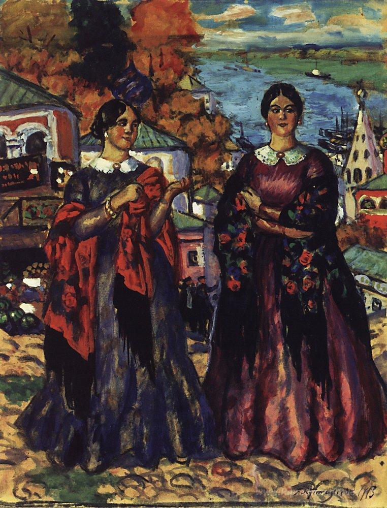 Ti offriamo una riproduzione artigianale su tela dell'opera famosa 'Due mogli di Merchant' di Boris Kustodiev, dal Museo delle Riproduzioni.