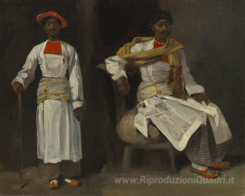 Ti offriamo una riproduzione artigianale su tela dell'opera famosa 'Due Vista di un indiano di Calcutta, seduti e in piedi' di Eugene Delacroix, dal Museo delle Riproduzioni.