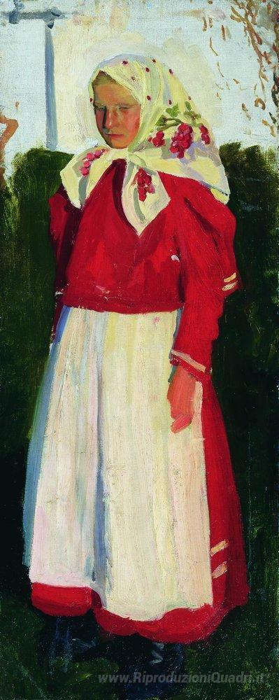 Ti offriamo una riproduzione artigianale su tela dell'opera famosa 'Dunya in rosso' di Boris Kustodiev, dal Museo delle Riproduzioni.