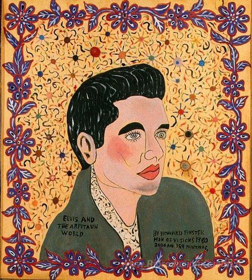 Ti offriamo una riproduzione artigianale su tela dell'opera famosa 'Elvis And The Arpitaun mondo' di Howard Finster, dal Museo delle Riproduzioni.
