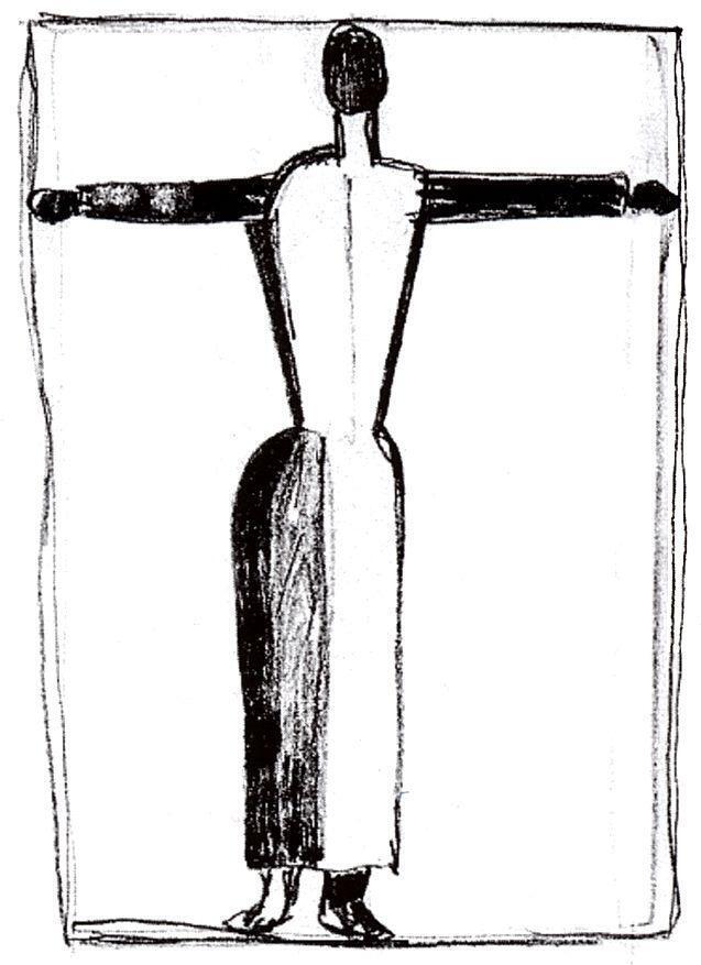 Ti offriamo una riproduzione artigianale su tela dell'opera famosa 'Figura sotto forma di una croce con le mani alzate' di Kazimir Malevich, dal Museo delle Riproduzioni.