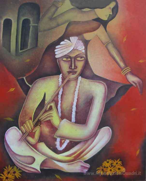 Ti offriamo una riproduzione artigianale su tela dell'opera famosa 'Flautista' di Jahar Dasgupta, dal Museo delle Riproduzioni.