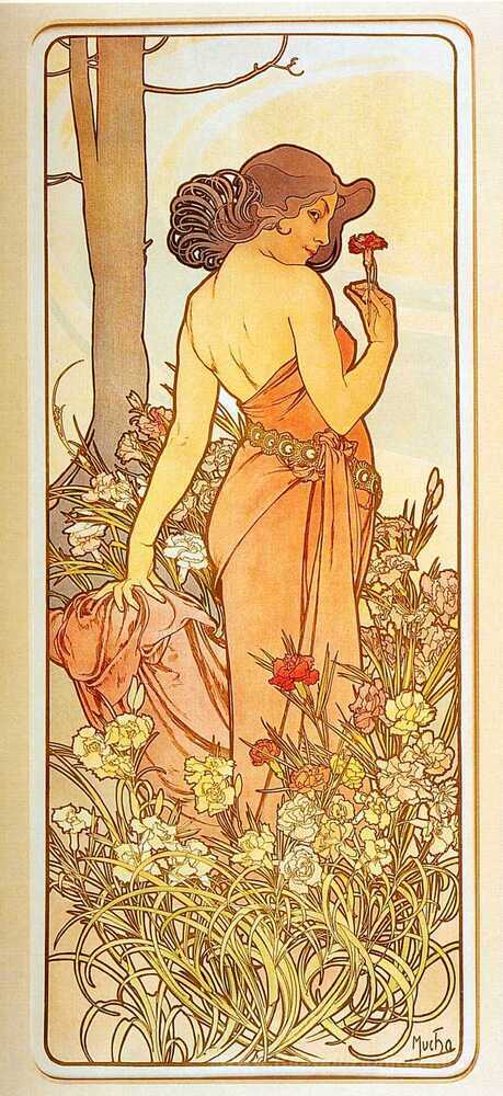 Ti offriamo una riproduzione artigianale su tela dell'opera famosa 'Garofano' di Alphonse Mucha, dal Museo delle Riproduzioni.
